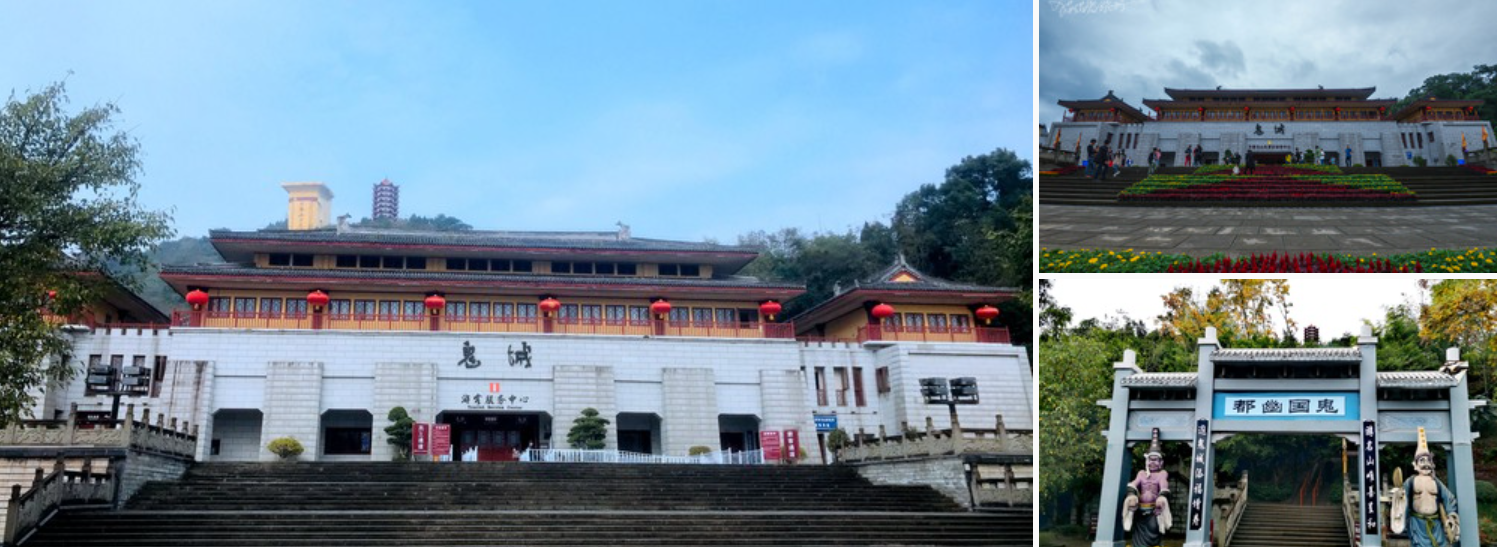 · With a history of nearly 2,000 years, it is famous for various architectural structures and shapes depicting the netherworld, composed of the Ghost City Ming Mountain Scenic Area and the Ghost King Stone Carving Scenic Area.