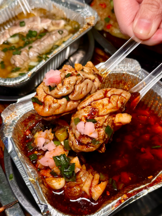 Chongqing Grilled Pig Brain is a special delicacy at Chongqing’s late – night snack stalls. Although the ingredient is unique, it has attracted many diners with its delicate texture and rich flavor. After cleaning fresh pig brains thoroughly, place them in a tin foil box and add seasonings such as ginger, garlic, bird’s – eye chili, dried chili peppers, Chinese prickly ash, light soy sauce, oyster sauce, cooking wine, etc. Then add a small amount of stock or water. Put the tin foil box on the charcoal fire and grill it slowly, turning it constantly to ensure even heating. As it grills, the pig brain gradually solidifies, and the flavors of the seasonings seep in. When it’s done, sprinkle chopped scallions and coriander on the surface and pour hot oil over it. The pig brain has a texture as delicate as tofu, soft and smooth when eaten, perfectly blending the spicy and numbing taste with the aroma of various seasonings, without any fishy smell. When eating, scoop it with a spoon, and each bite is full of rich flavors. It’s a unique delicacy in Chongqing barbecue, especially popular among diners who enjoy trying new and novel foods.